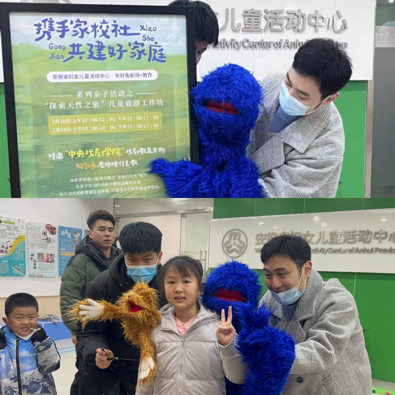 2月19日,安徽艺术学院戏剧学院第一学生党支部党员陈孜恒、许骏豪、王鹏飞策划“探索天性之旅”儿童戏剧工作坊,助力省妇儿“携手家校社,共建好家庭”系列亲子活动。