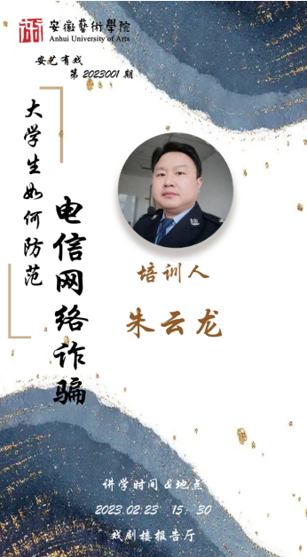2月23日,戏剧学院针对毕业实习学生,开展了题为“大学生如何防范电信网络诈骗”的宣传报告会。特邀合肥市公安局三级警长朱云龙作报告。会议由教科研主任阚侃主持。