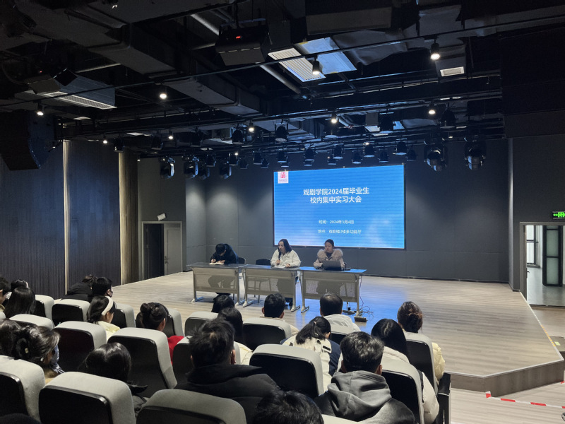 为提升学生实践能力,拓展职业视野,安徽艺术学院戏剧学院于3月4日举行毕业生校内集中实习大会。戏剧学院副院长张静、学管办主任孔晓欣、教科研办副主任胡宇笛等戏剧学院教师辅导员参加会议。