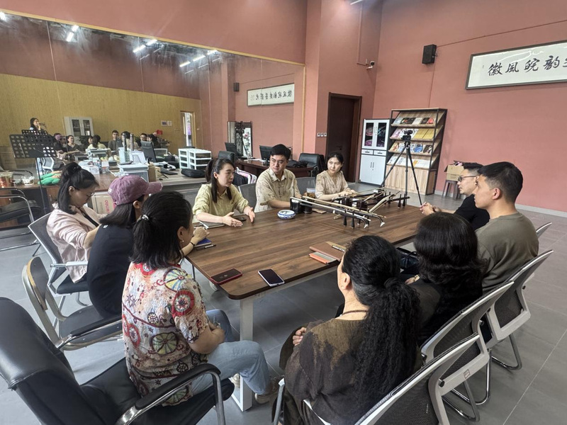 上午专题讲座,王谋老师系统阐释了黄梅戏唱腔的种类与调式运用,深入分析不同唱腔类型在主胡伴奏中的音乐特征与情感表达方式。下午实践环节,王谋老师以黄梅戏经典剧目选段为例,详细讲解了主胡演奏中的弓法、指法及装饰音等技法要点,并现场示范其在不同剧情、角色中的具体运用。通过精准的技法解析与生动的音乐表现,充分展示了主胡在黄梅戏音乐中不可替代的艺术价值。互动交流环节,教研室教师积极提问,就日常教学中遇到的演奏难题向专家请教。大家围绕主胡的教学方法、技法训练、舞台配合等内容展开深入探讨,现场气氛热烈,交流成果显著。