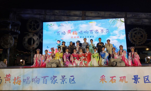 2024年5月24日19:30,由安徽省文化和旅游厅主办,安徽省文化馆、马鞍山市文化和旅游局承办,安徽艺术学院等多家单位联合协办的“百场黄梅唱响百家景区”系列活动——采石矶景区专场演出,在马鞍山市采石风景名胜区成功举办。活动通过国家公共文化云、“好戏安徽”及百家自媒体平台同步直播,线上观看量达17.8万人次以上,现场观众5000人左右,座无虚席。