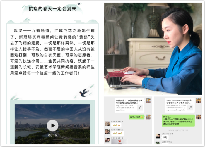 王雅卓所带班级的同学还积极参与疫情防控,主动作为:有些学生选择成为志愿者,在社区或是村庄路口为居民量体温、做登记;有的则慷慨解囊,把积攒的零花钱捐献给武汉地区。2018级播音主持专业学生党员陈啸天就是其中一员。他积极投身防控战场,主动请战冲锋,在家乡安庆市太湖县防疫指挥部一线志愿服务。期间王雅卓与陈啸天同学保持密切联系,时刻提醒他做好防护,注意身体,并将他的所作所为在班级群中进行宣传,鼓励同学们团结“艺”心战疫情。(撰稿:金转 初核:张志云 审定:束舒娅)