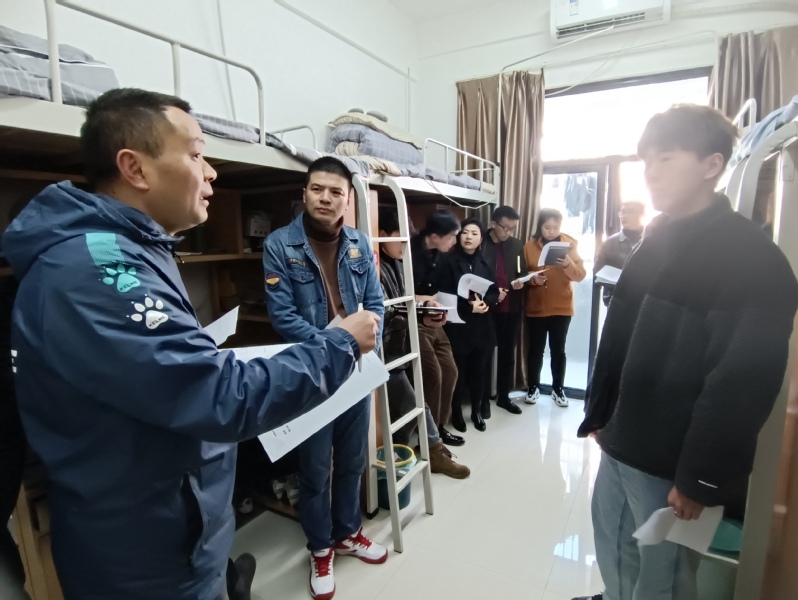 一行人重点走访参观了音乐舞蹈系21级体育舞蹈班C1楼103宿舍,开学初学生返校卫生大检查时,该宿舍整体环境较差,经过班会《通知》学习和辅导员深入一线的帮扶,宿舍焕然一新,学习环境明显提高,一跃成为班级同学的榜样。实地学习,就是要选树优秀典型,多树正面典型,常态化开展、常态化宣传,要一个人一个人过、要一个宿舍一个宿舍过,达到要求并长期保持,抓铁有痕,踏石留印。克服畏难情绪,增强信心,提振决心,坚决打赢文明创建阻击战!