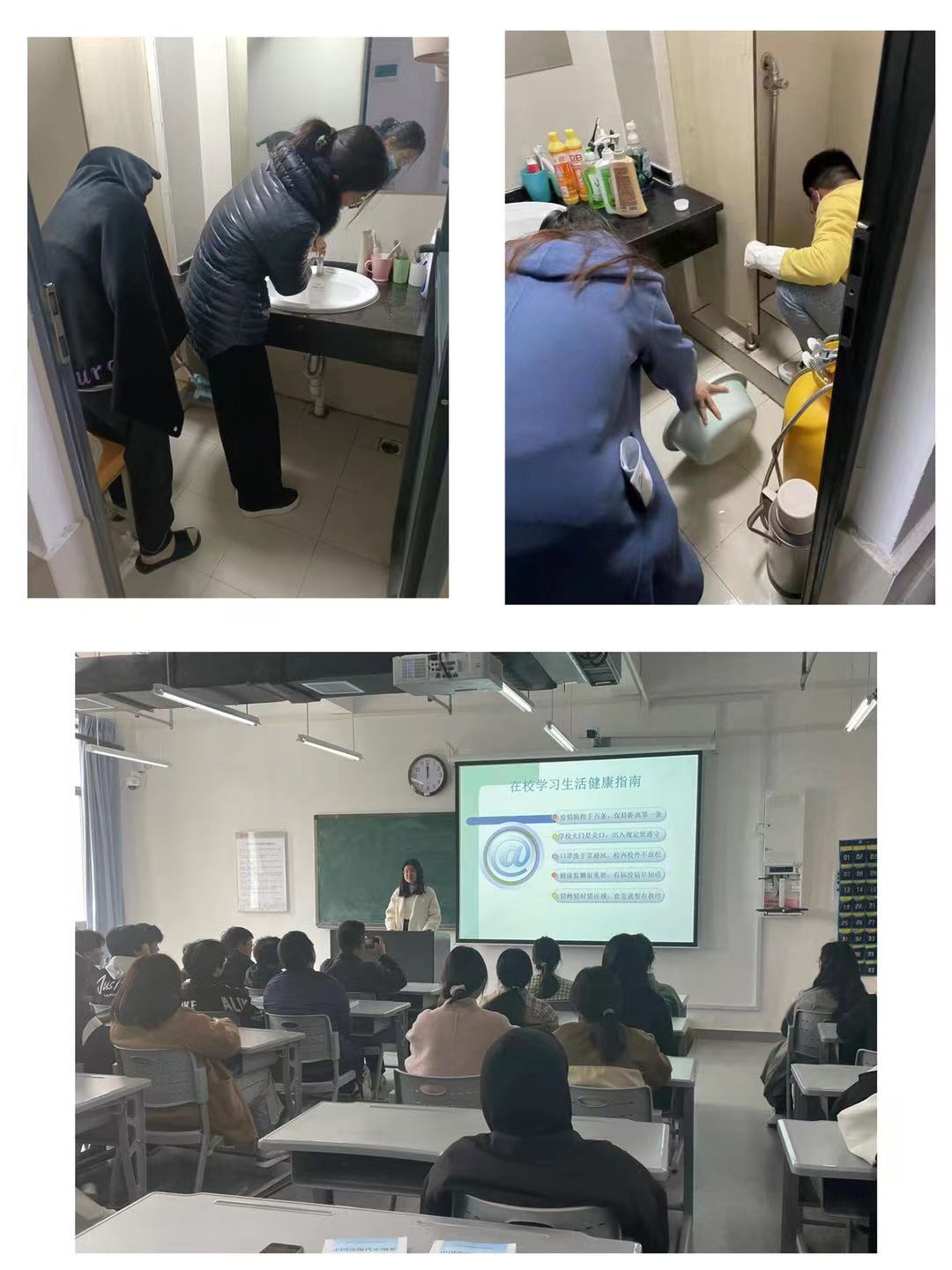 学工一线辅导员带领班级学习教育部办公厅下发《学生疫情防控期间在校学习生活健康指南》、深入宿舍和学生一起整卫生搞消杀。