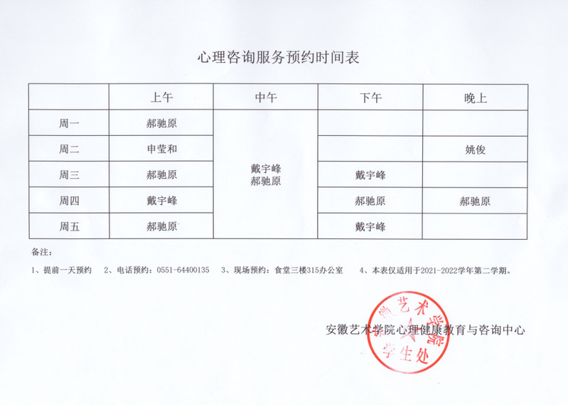 心理咨询丨2021-2022学年第二学期心理咨询服务预约时间表