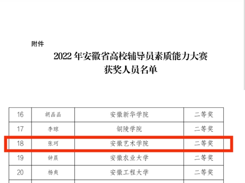 近日,中共安徽省委教育工委公布了安徽省2022年高校辅导员素质能力大赛结果,我校音乐舞蹈系专职辅导员张珂老师荣获全省高校辅导员素质能力大赛二等奖。