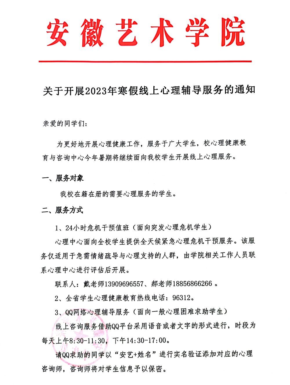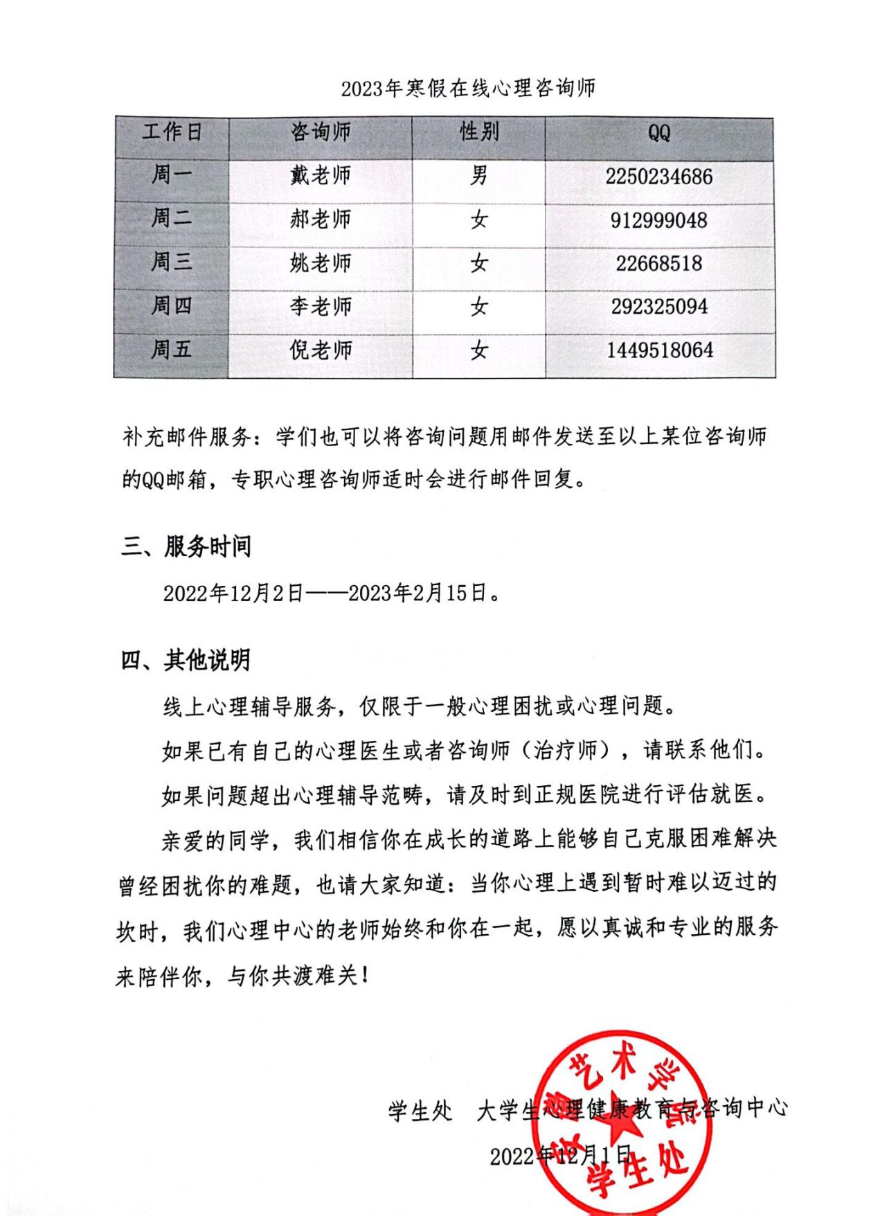 关于开展2023年寒假线上心理辅导服务的通知