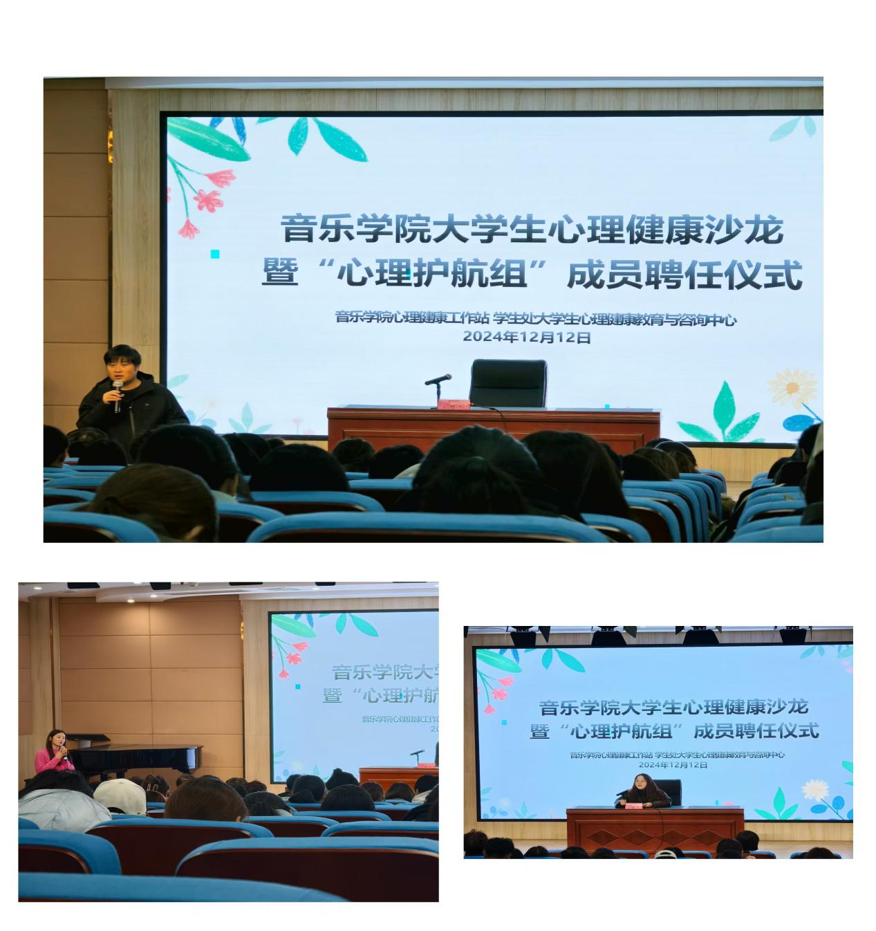 2024年12月12日,音乐学院大学生心理健康沙龙暨“心理护航组”成员聘任仪式在音乐南楼报告厅隆重举行。此次活动由音乐学院心理健康工作站与学生处大学生心理健康教育与咨询中心联合主办,旨在增强学生心理健康教育,提升学生应对压力及心理问题的能力。活动由音乐学院心理健康工作站站长张珂主持,音乐学院大一、大二学生积极参与。