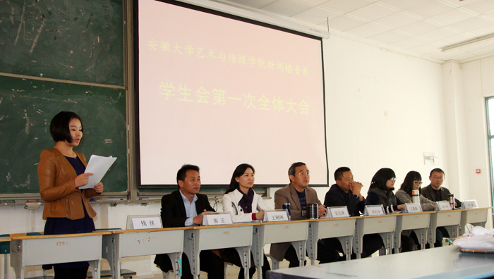 2014年11月12日下午 15:10分,安徽大学艺术与传媒学院新闻播音系学生会成立大会在第二阶梯教室隆重举行。大会由钱佳老师主持。新闻播音系主任吴孔铎,教务学生工作部副部长、团委书记刘长华出席会议。系部老师刘涛、王琍琍、王荔挺、戚庆燕、周正以及学生会全体成员参加了此次会议。
