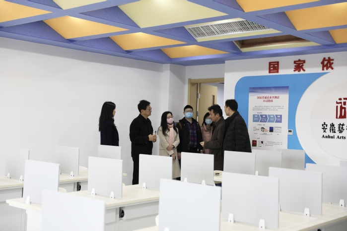 调研组一行先参观了即将启用的安徽艺术学院普通话测试中心,现场查看了设备、设施,随后对融媒体中心、VR新媒体党员活动中心的施工进展进行了考察,并对布局和内容提出了建议。