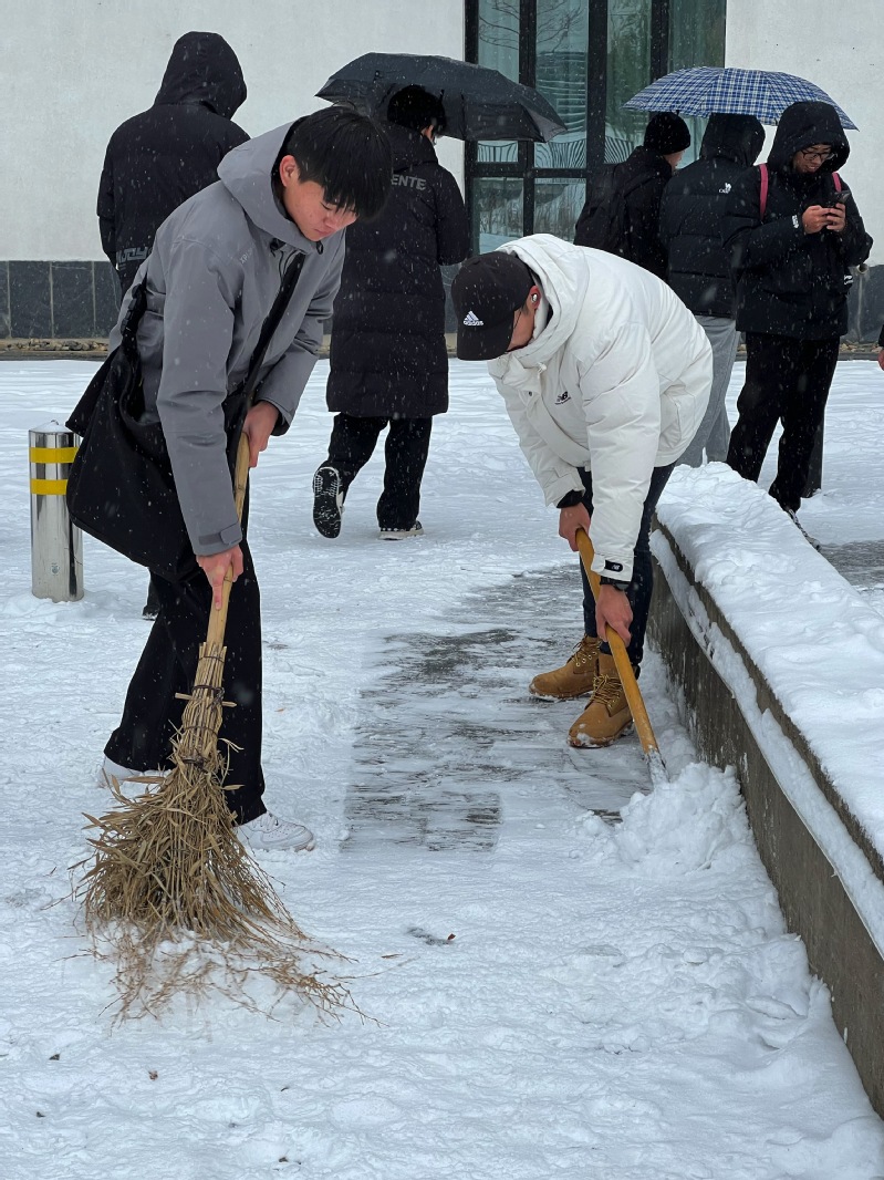12月18日下午,为了保障同学们在雪后的出行安全,传媒学院第一学生党支部的党员们来到播音楼门口,开始了扫雪工作。