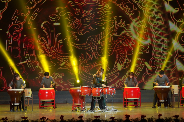 演出正式开始后,舞台由暗转明,急促的鼓点突然响起,炽热的情绪吸引了全场的注意。《龙腾虎跃》这首由我校打击乐团演奏的中国锣鼓乐经典名曲一锤定音,富有激情的演奏,渲染了气势壮阔的欢腾场面,寓意着祖国的繁荣昌盛。五音排鼓、花盆鼓、中国大鼓等多种中国民族打击乐代表性乐器,以领奏、合奏相间的方式全新演绎传统浙东锣鼓的音调,既有浓浓的民族味,又有深深的学院风。