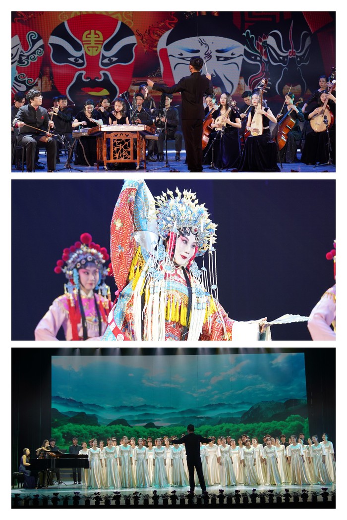 徽京对唱《贵妃醉酒》,古典民间乐器和西洋乐器合奏的京胡名曲《夜深沉》等我校师生的演出节目,都对经典做了创造性编排,展现了优秀中华文化的丰富内涵和悠长韵味。