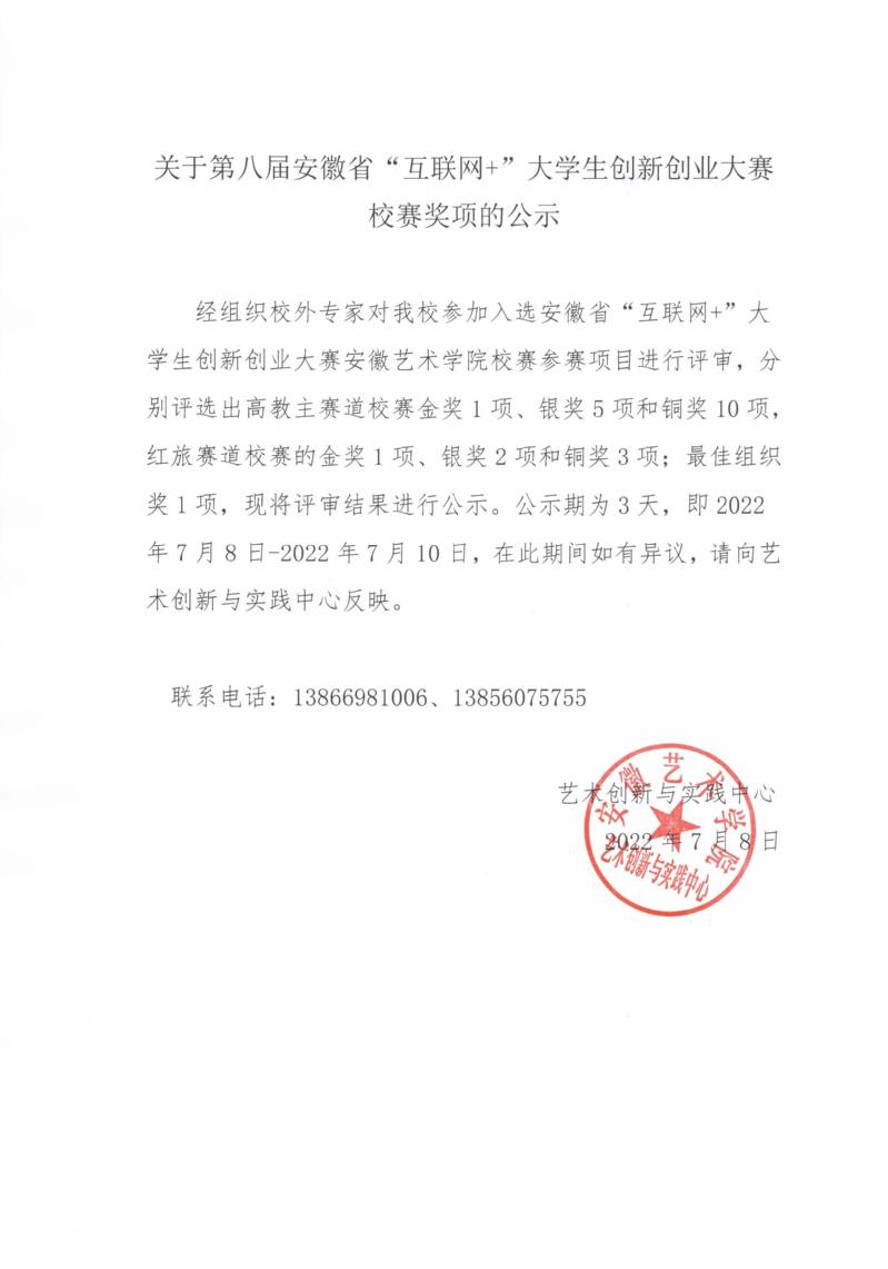 关于第八届安徽省“互联网+”大学生创新创业大赛校赛奖项的公示