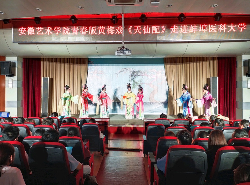 5月27日下午,我校戏剧学院青春实验剧团孵化传统戏曲复排项目黄梅戏青春版《天仙配》在蚌埠医科大学学术报告厅演出,现场200余名师生观看了演出。这次演出由安徽艺术学院和蚌埠医科大学联合主办,是我校优质文艺创作作品走出校园、扩大交流、服务社会的重要活动.