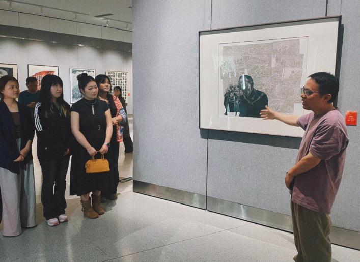 开展当天,我院版画方向师生赴现场观摩学习。观展前,安徽省美协版画艺术委员会主任、我校客座教授师晶首先介绍了本次展览的整体情况。随后,我院教师张婷婷对部分作品进行了专业导赏。在互动环节中,部分参展艺术家们从创作理念、技法运用、情感表达等维度,深入解读了自己作品背后的艺术思考,与我院师生围绕主题性版画的创作实践展开了交流与分享,通过思想碰撞进一步拓展了艺术视野。