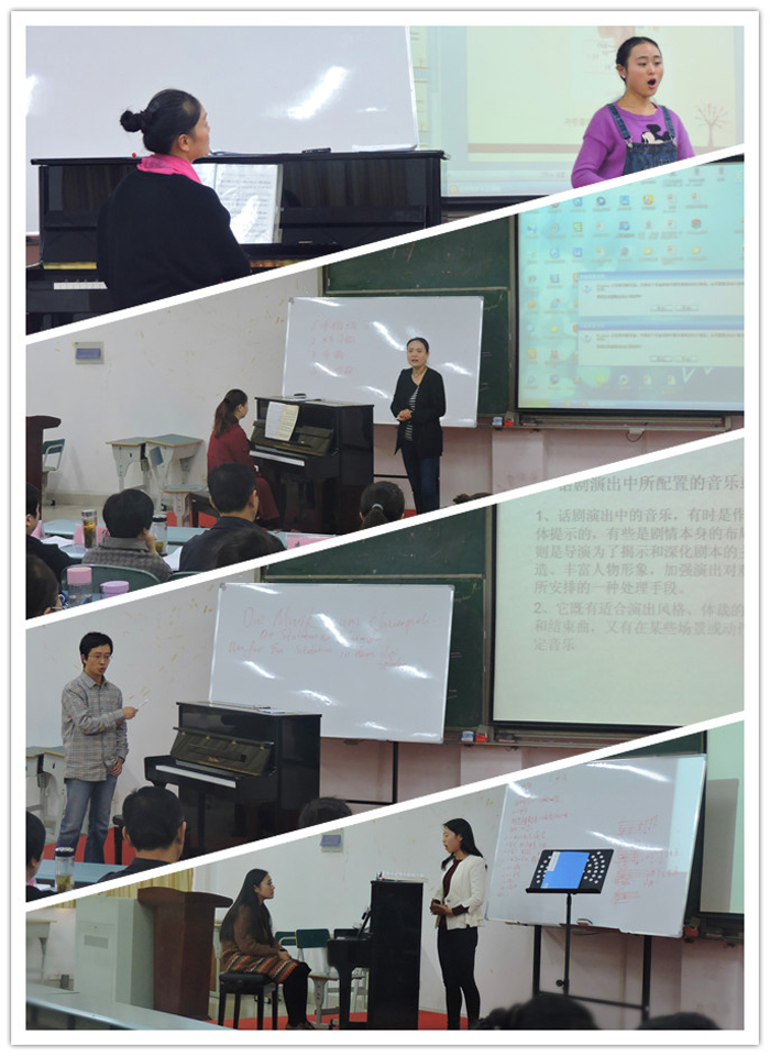 2015年10月28日下午,音乐舞蹈系在一教第二阶梯教室隆重举办了“青年教师教学基本功竞赛”决赛,参赛的11位青年教师都是在“教研室青年教师教学基本功展示活动”中脱颖而出的,老师们以丰富的教学形式、科学的教学方法、精彩的讲解展示了他们较高的艺术素养和扎实的教学功底,感染了现场师生,获得了大家的一致好评。现场观摩的同学说:“看了老师们的精彩讲解,发现自己要学的东西太多,深有感触,有这样的老师真好!”