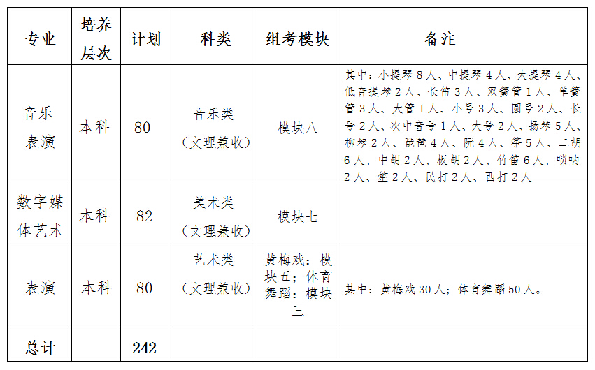 2.组考模块三对应的专业按综合分1投档录取。即综合分1=专业成绩/专业满分*300+文化成绩/文化满分*700(专业成绩、文化成绩达到安徽省划定相应批次分数线)。