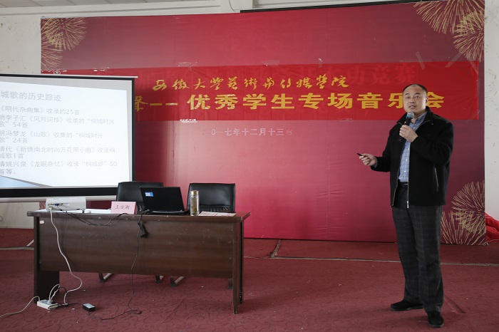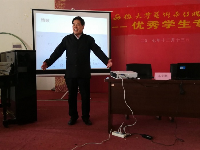 王安潮以安徽省代表性民歌——桐城歌为例,通过对古代文献的考辨,对现有乐谱、口传资料的辨析,归纳出桐城歌的历史特点、艺术特征,详细论述了不同类型、不同题材的桐城歌在本体、文化上的特色,并阐述了民歌在历时性层面所呈现出的不同特点。王安潮认为,受到语言、题材等因素的影响,不同类型的桐城歌在旋律、节奏、调式等方面有着不同特征显现,藉此而对相应的编创发展进行诠释。让我院师生和社会各界参与的观众感受到桐城歌受古代文人、桐城文学的影响及显性特征,对唱词的典雅、旋律的动听有感性认知。