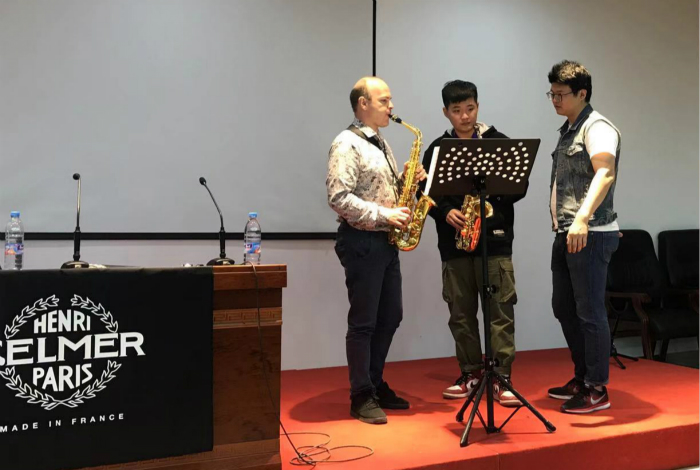 上午8点半,Vincent David于我院美术楼学术报告厅为广大师生奉献了一场别开生面的大师课。Vincent David从萨克斯管的历史渊源说起,生动风趣地介绍了19世纪著名作曲家柏辽兹、比才如何通过自己的作品,将萨克斯管这件当时还不知名的乐器从皇家军乐队带入到交响乐队的历程以及萨克斯管在当今世界迅猛发展的现状。