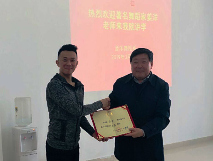 3月15日、16日,国际知名编舞家、法国国家歌剧院里昂芭蕾舞团首席、文化部“海外高层次文化人才”引进人员、“国家艺术基金”特邀教授姜洋来我院开展了为期两天的实践交流。姜洋客座教授受聘仪式在舞蹈楼四楼会议室举行,学院党委书记、校长周之虎亲切接见姜洋,颁发证书,并向他介绍了我院申报设置安徽艺术学院的相关情况。周之虎指出,在申报设置的关键时刻,能够邀请到出色的舞蹈家前来,给学校增添了生机,更鼓舞了士气。学校人事处、音乐舞蹈系负责人及部分教师代表出席受聘仪式。