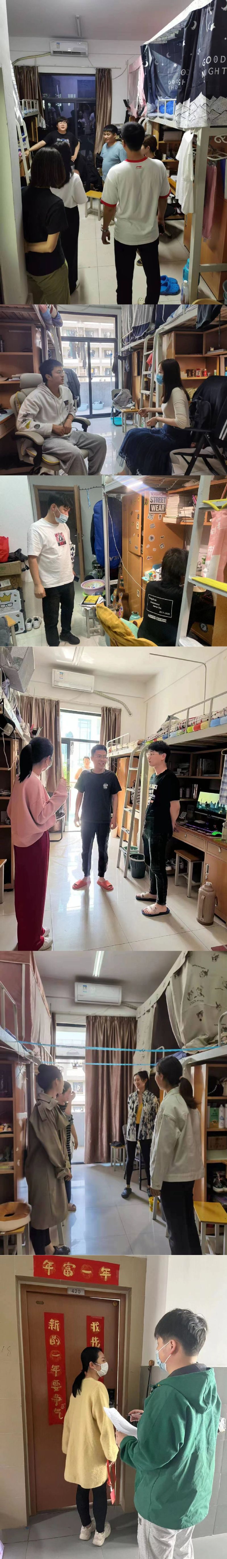 系部学工队伍听取学生建议的同时也对部分学生自身存在的一些问题进行批评指正,要求同学们要遵守学校宿舍管理规定,不私自离校外宿,规范作息习惯,保持宿舍干净卫生,舍友之间要相亲相爱等。本学期的下沉宿舍走访活动贯彻了以学生为本的服务理念,密切了师生之间的关系,有利于我系文明宿舍风貌的养成。
