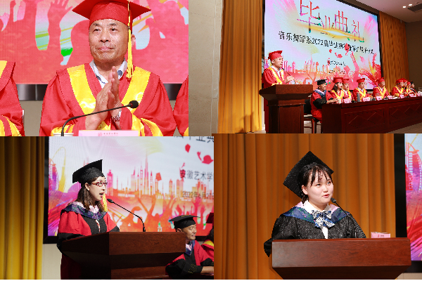 民进安徽艺术学院支部主委、声乐与歌剧教研室黄凤霞副教授作为教师代表上台发言。黄凤霞老师对2022届毕业生在校期间顺利实现蜕变表示赞扬,并寄语毕业生走出校门后一定要不忘初心、牢记使命,热爱学习、追求真理,铭记校训,奋勇拼搏,要用大爱无疆的胸怀描绘大写的人生。