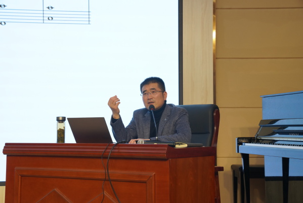 11月24 日,音乐学院副院长薛业浩以“和声课程的定位及教学”为题在音乐南楼报告厅做了精彩讲座,作曲与指挥教研室主任孙四化主持活动。在“和声课程的定位及教学”的讲座现场薛老师从和声现象的发生是自然物理规律的发现和利用泛音基础上建立起来,人们主观意识上改造起更大的作用,进而形成各种风格的和声展开了精彩的演讲。