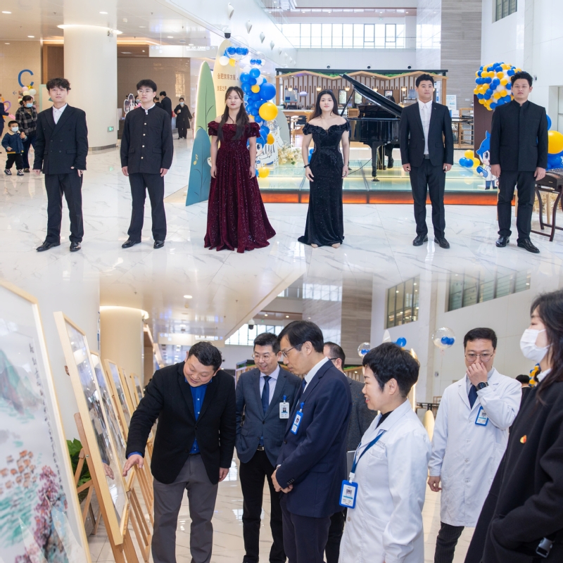 在医院大厅,设计学院的学生们带来了多种题材的画作供大家欣赏。音乐学院和传媒学院的师生们精心准备了声乐、器乐、朗诵等文艺节目。本次演出的曲目有小组唱《唱支山歌给党听》《百年》,女声独唱《火把节的狂欢》,钢琴独奏《肖邦变奏曲》op.12与《匈牙利狂想曲》op.6,古筝独奏《柳青娘》、二胡独奏《赛马》和朗诵《可爱的中国》。