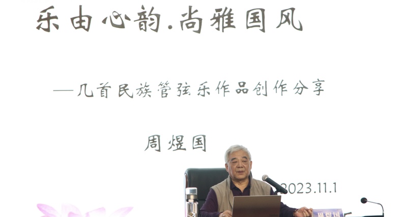讲座中,周煜国以自身创作历程为主体线索展开,介绍其各类代表作品的创作灵感与结构。如作品《忆事曲》(扬琴与乐队)、《滇乡风俗画四帧》(民族管弦乐组曲)、《遐方怨》(笛子与乐队)、《云裳诉》(古筝与乐队)等。他详细讲解了民族管弦乐作品的创作形式和内容,提高了师生民族管弦乐作品的赏析能力。