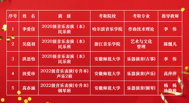 在此,我们向这五位成功考取研究生的学子表示热烈的祝贺,并向辛勤付出的教师们表示衷心的感谢。让我们共同期待他们在未来的学术和艺术道路上取得更加辉煌的成就。