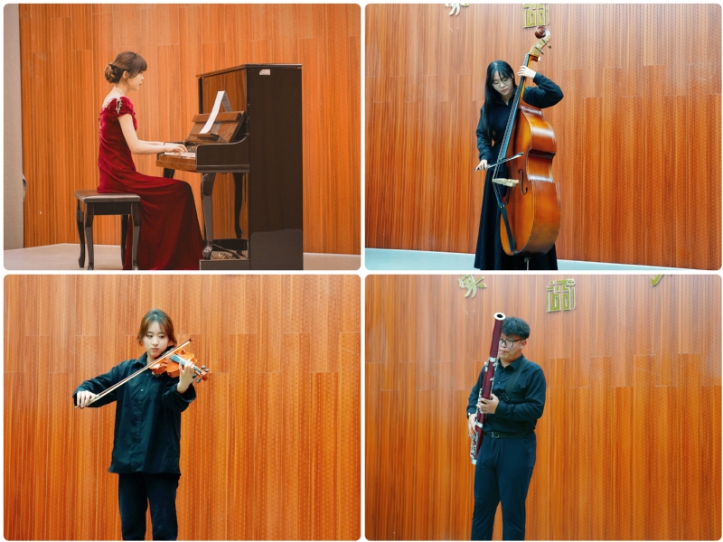 中西交融,和谐之美。西洋乐器演奏部分则是本次活动的另一大亮点。学生们通过管弦乐和钢琴等西洋乐器的演奏,将中外音乐文化进行了完美的融合。他们演奏了多首安徽风格音乐的改编作品,包括《谁料皇榜中状元(改编曲)》《对花(改编曲)》《黄梅调(改编曲)》《三月里来桃花开(改编曲)》等。这些作品的学习和演奏,不仅拓宽了学生们的音乐视野,也让他们感受到了不同音乐文化之间的碰撞与交融之美。