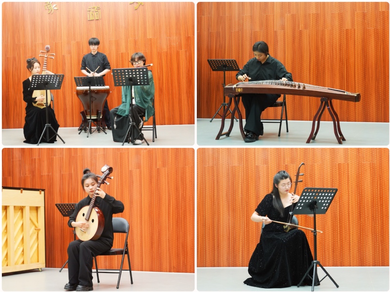 传统之音,韵味悠长。民族乐器演奏部分是本次活动的重点之一,学生们带来了二胡、琵琶、古筝等安徽传统乐器的精彩演出,音乐会作品由《淮水》《喜庆锣鼓》《划龙船》《山野的风——黄梅戏主题变奏曲》(为五件民族乐器而作)等组成。他们通过精湛的技艺和深情的演绎,将安徽民间音乐的韵味传递给在场的每一位观众。