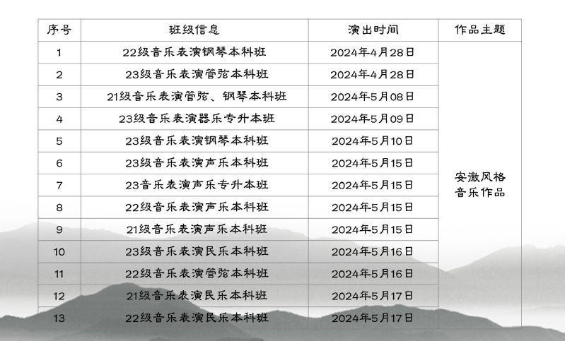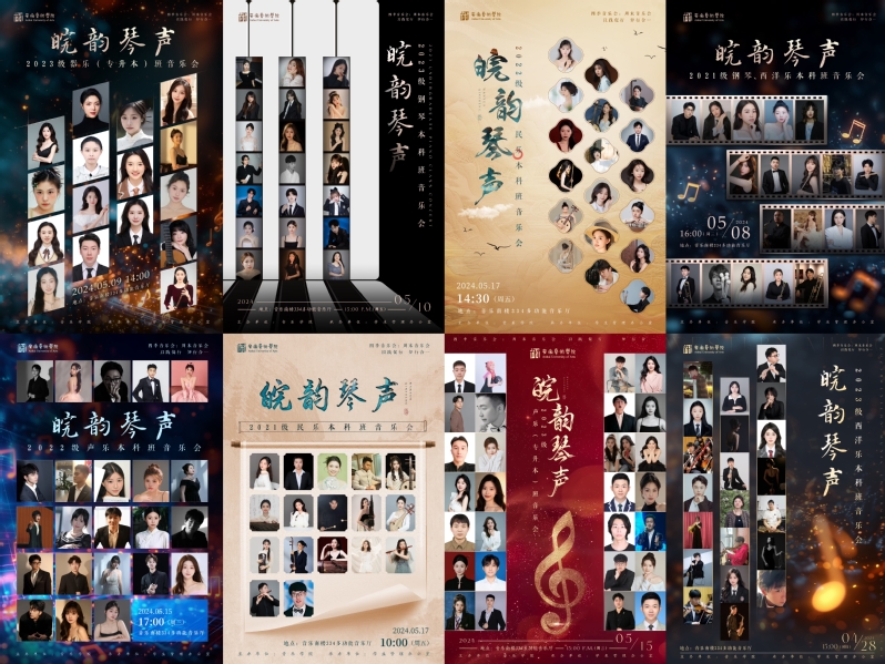 为弘扬安徽地方民间音乐文化,提高学生的专业技能和综合素质,学院学生管理办公室于2024年4月24日至5月17日举办了为期三周的“皖韵琴声”周末音乐会系列活动。本次活动共包含13场演出,涵盖民乐、管弦乐、声乐、钢琴和作曲五个专业领域。具体班级的演出时间及部分海报信息如下: