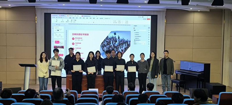 大会开始,汪伊珺追溯了管弦教研室自成立以来的发展历程与基本概况。阐述了教研室的师资阵容、客座教授、艺术团及管弦学生助理岗位等情况。明确了交响乐团、交响管乐团的组织架构体系,并为24 年度首席/声部长、团长助理等颁发了证书,这不仅是对优秀团员的认可,更是对管弦专业未来发展的重要推动。同时,公布了接下来艺术实践周特邀专家的相关信息及演出季活动安排,让学生们对即将到来的艺术实践活动充满期待。