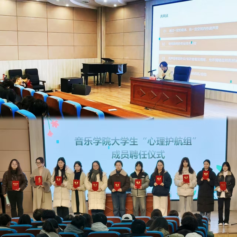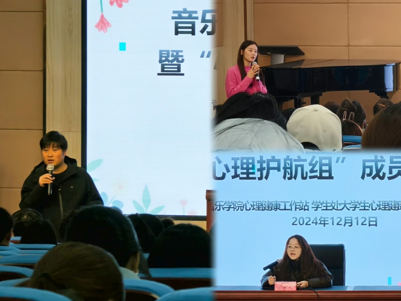 2024年12月12日,音乐学院大学生心理健康沙龙暨“心理护航组”成员聘任仪式在音乐南楼报告厅隆重举行。此次活动由音乐学院心理健康工作站与学生处大学生心理健康教育与咨询中心联合主办,旨在增强学生心理健康教育,提升学生应对压力及心理问题的能力。活动由音乐学院心理健康工作站站长张珂主持,音乐学院大一、大二学生积极参与。