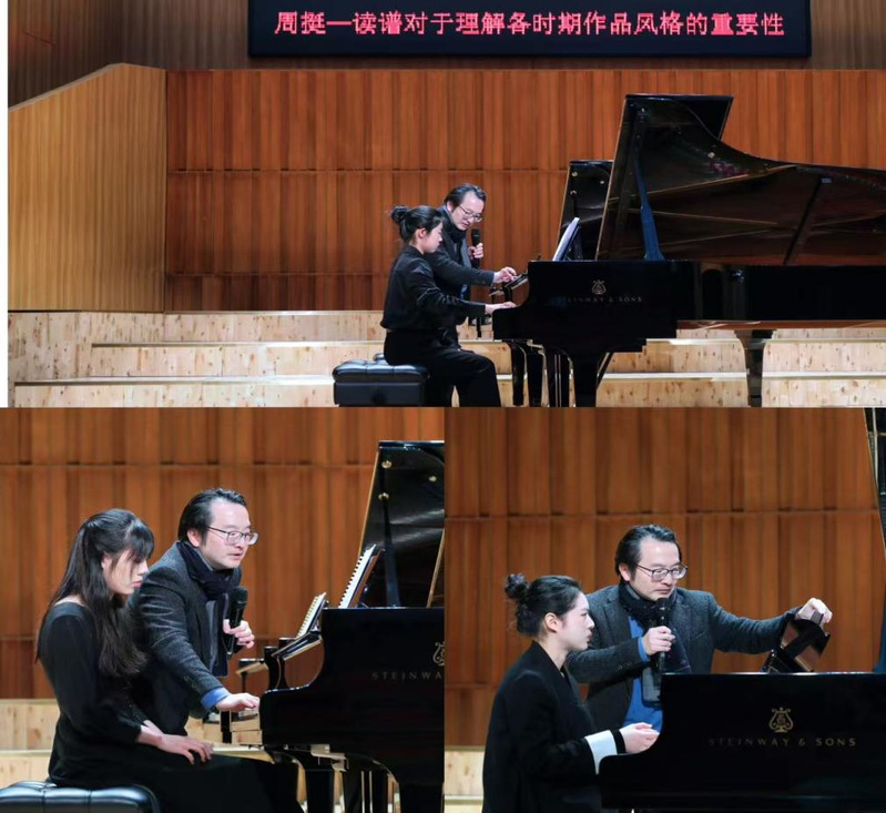 此次实践讲座分为两个环节,学生作品演奏指导和“读谱对于理解各时期作品风格的重要性”解读。22级与23级三位同学分别演奏了拉赫玛尼诺夫《音画练习曲》Op.39 No.5、肖邦练习曲Op.10 No.5、贝多芬奏鸣曲Op.90第一乐章。周挺教授从学生自身演奏困难问题、舞台音响效果、音乐织体、和声、触键等方面进行了细致的讲解,给学生们提出切了实有效的解决办法。
