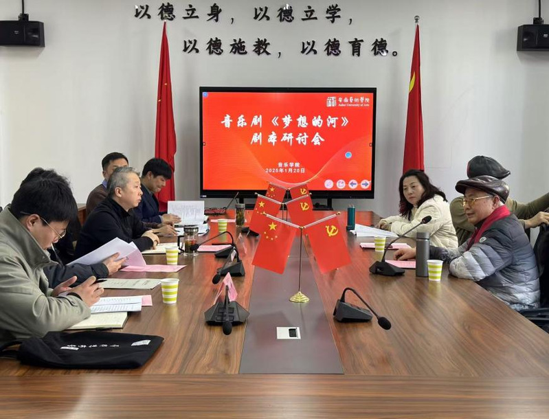 1月20日14:30,音乐学院在南楼104会议室组织开展音乐剧《梦想的河》剧本研讨会。三位外请专家:安徽省文联原副主席,安徽省戏剧家协会原主席,一级编剧王长安,安徽省演出总公司原总经理、一级导演沈晓梅以及一级导演李义田出席。我校戏剧学院沈后庆教授、姚爽博士以及音乐剧作曲张中灿、导演李申参加。会议由音乐学院党总支书记、院长李伟主持。