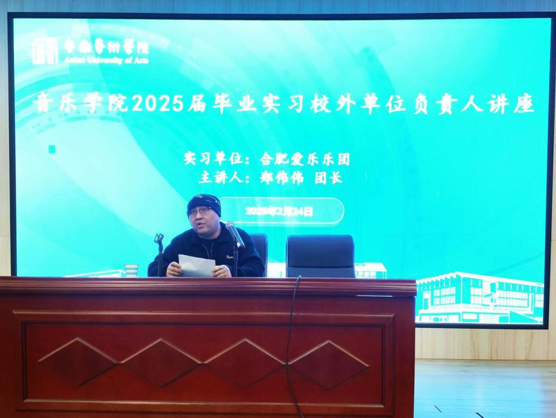 2月24日下午15:00,音乐学院在音乐南楼报告厅成功举办2025届毕业实习校外单位负责人讲座。由校外实习单位合肥爱乐乐团团长郑伟伟主讲,教科研办副主任朱临吉主持。