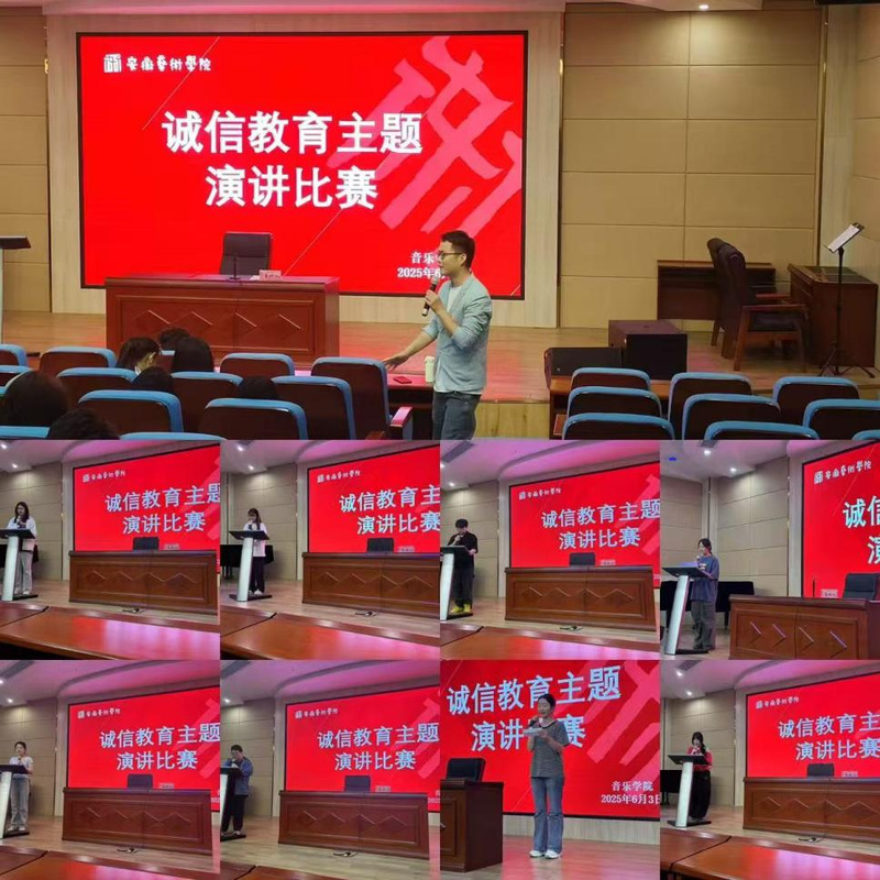 为弘扬诚信美德,培育学生诚信意识,2025年6月3日中午,音乐学院诚信教育演讲比赛在音乐南楼报告厅举行。音乐学院辅导员何刘涛老师组织本次比赛。