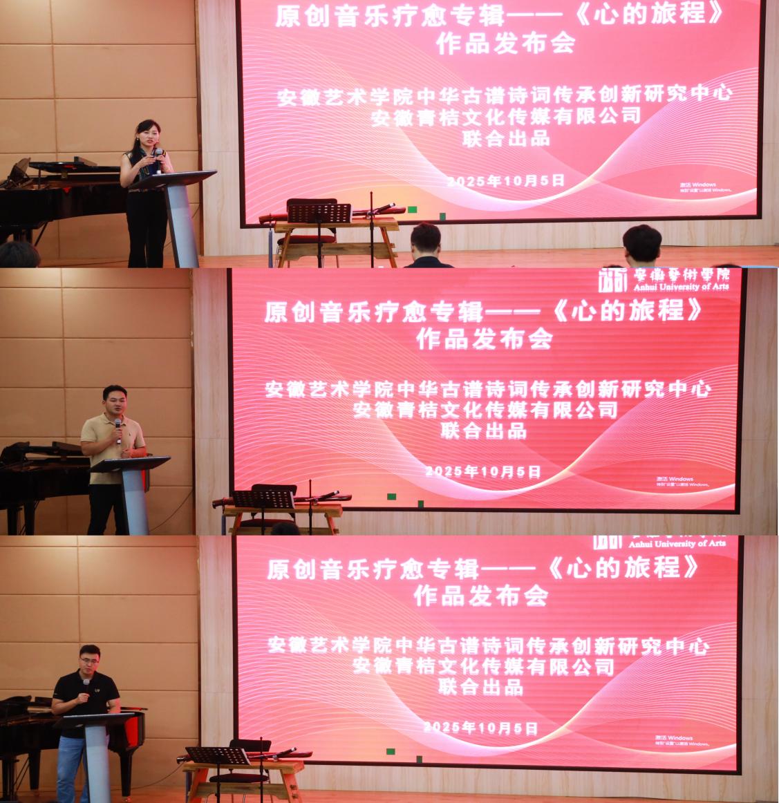 作为专辑联合出品方,安徽艺术学院中华古谱诗词传承创新研究中心与安徽青桔文化传媒有限公司从学术研究到艺术创作,为专辑的专业性与疗愈效果保驾护航。旅美艺术指导、美国西弗吉尼亚大学音乐博士、音乐认证疗愈师杨霖希率先分享专辑创作故事,她详细介绍了传统音乐元素与现代疗愈理念的融合过程,让现场观众深入了解专辑背后的匠心。随后,安徽青桔文化传媒负责人赵化彬上台致辞,他表示,打造《心的旅程》的初心是希望为当代人提供一份 “声音良药”,帮助人们在快节奏生活中找到内心的宁静。安徽中医药大学心理学系主任张航教授从专业角度给出解读。他指出,《心的旅程》并非普通音乐专辑,其收录的旋律不仅舒缓平静,更巧妙搭配雨声、海浪声等自然白噪声,融入颂钵、铜锣、风铃等元素,能以特定频率影响人体能量场与脑波状态,通过细胞和谐共振调节神经、内分泌与免疫系统。经专家鉴定,专辑已具备治疗睡眠障碍、助眠、缓解焦虑、释放负面情绪等多重疗愈功能,为音乐疗愈的科学性提供了权威支撑。