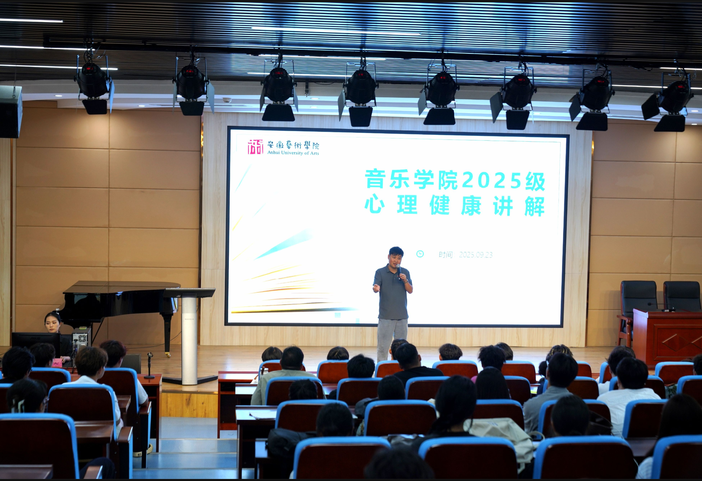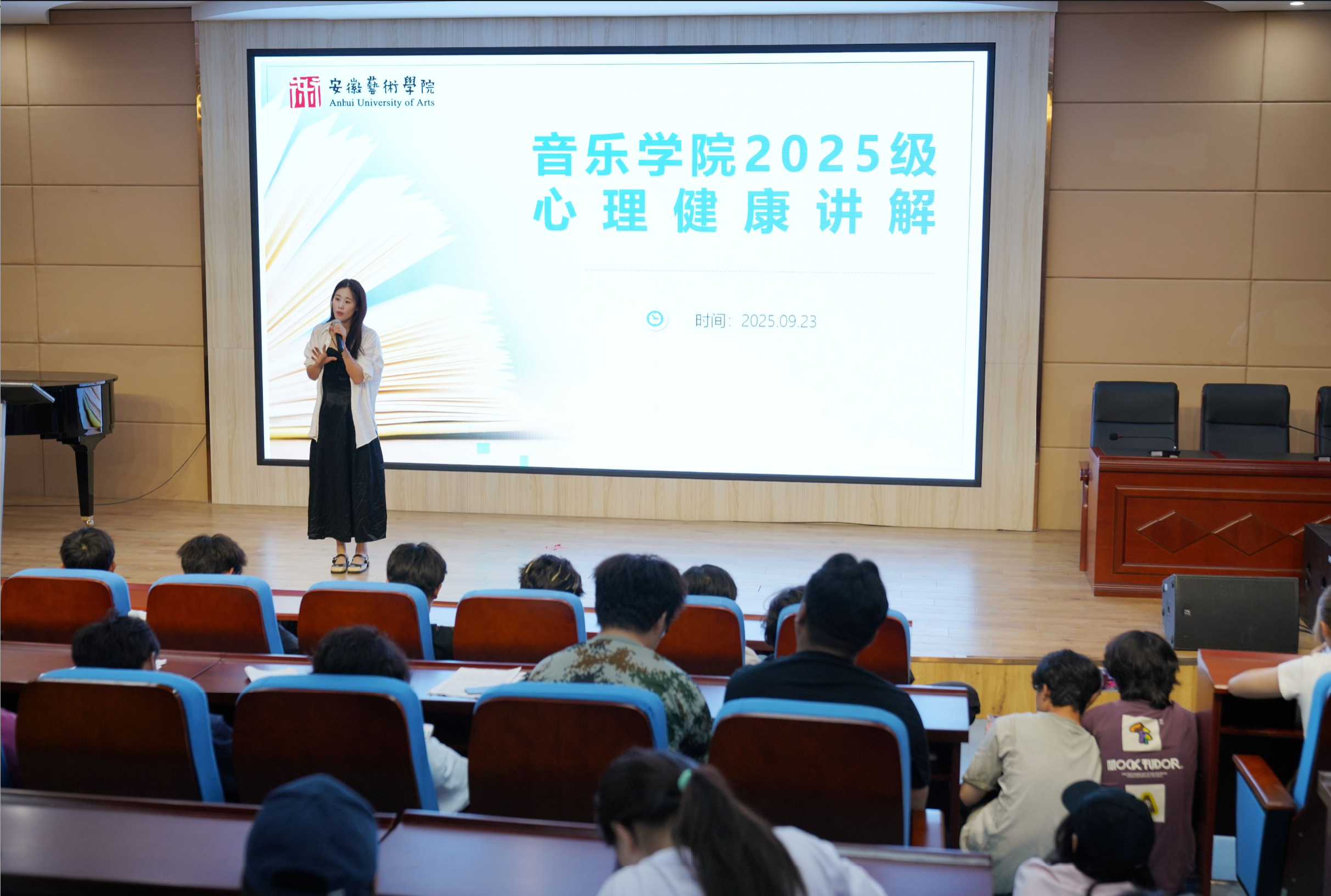 为进一步普及心理健康知识,提升学生心理调适能力,营造积极健康的校园氛围,音乐学院于2025年9月23日中午在音乐南楼报告厅成功举办了“心启航,乐成长”大学生心理健康主题宣讲会。本次宣讲会由学院心理健康站站长张珂老师主持,学院2024级、2025级全体学生参加了活动。