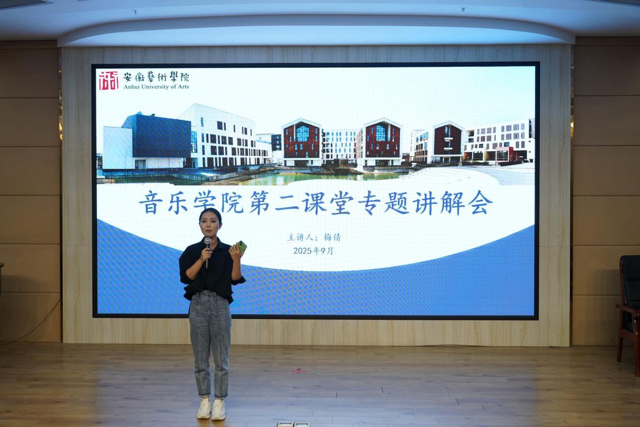 宣讲会上,梅倩围绕《安徽艺术学院第二课堂学分管理办法》的主要内容、模块设置、学分要求及评定流程等方面进行了详细解读。重点介绍了“德、智、体、美、劳”五大模块的必修学分要求,强调了第二课堂学分与学位授予的关联性,提醒同学们高度重视第二课堂学习,尽早规划、积极参与、及时申报。