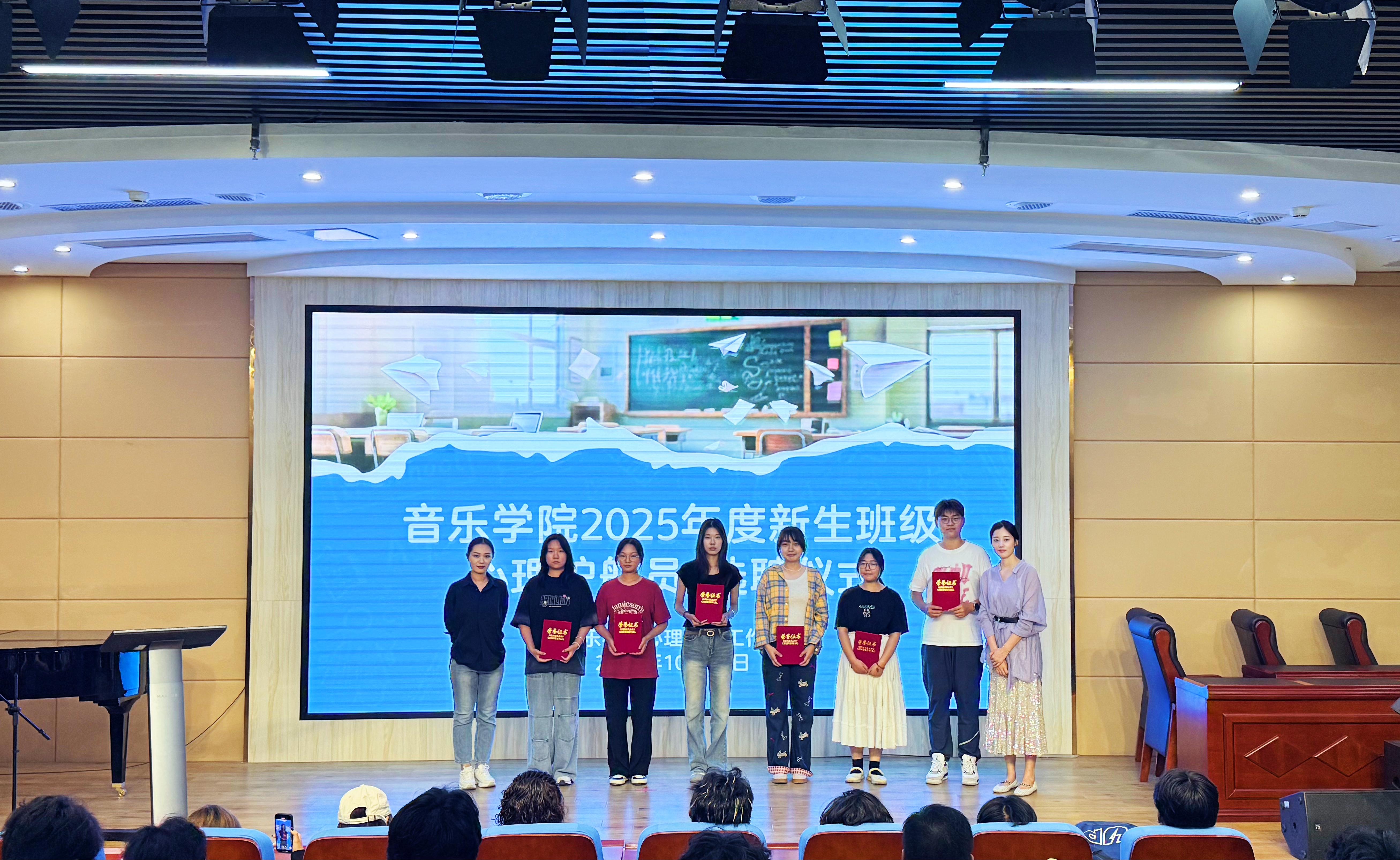 2025年10月10日,音乐学院在音乐南楼报告厅隆重举行2025级新生班级心理护航员聘任仪式。经过各班级认真遴选,易婷等六名同学受聘,正式肩负起为同窗心灵成长保驾护航的职责。本次活动由学院心理健康站站长张珂主持,2025级全体学生参与活动。