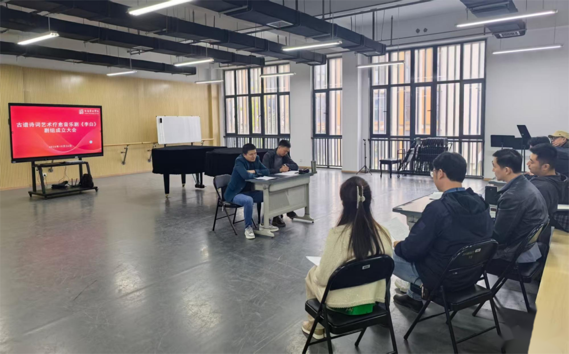 2025年10月26日下午,马鞍山艺术剧院委托安徽艺术学院的横向课题项目——古谱诗词艺术疗愈音乐剧《李白》(暂定名)剧组成立大会,在安徽艺术学院音乐南楼隆重召开。项目负责人张祖顺(饰演李白)、导演杨高猛、编剧冯传胜、音乐总监赵化彬等剧目主创成员,曹磊(饰演唐明皇)、秦帅(饰演高力士)、张研(饰演李龟年)、谢潘婕(饰演杨贵妃)等主要演员,以及部分舞蹈演员和剧组工作人员共同参会。