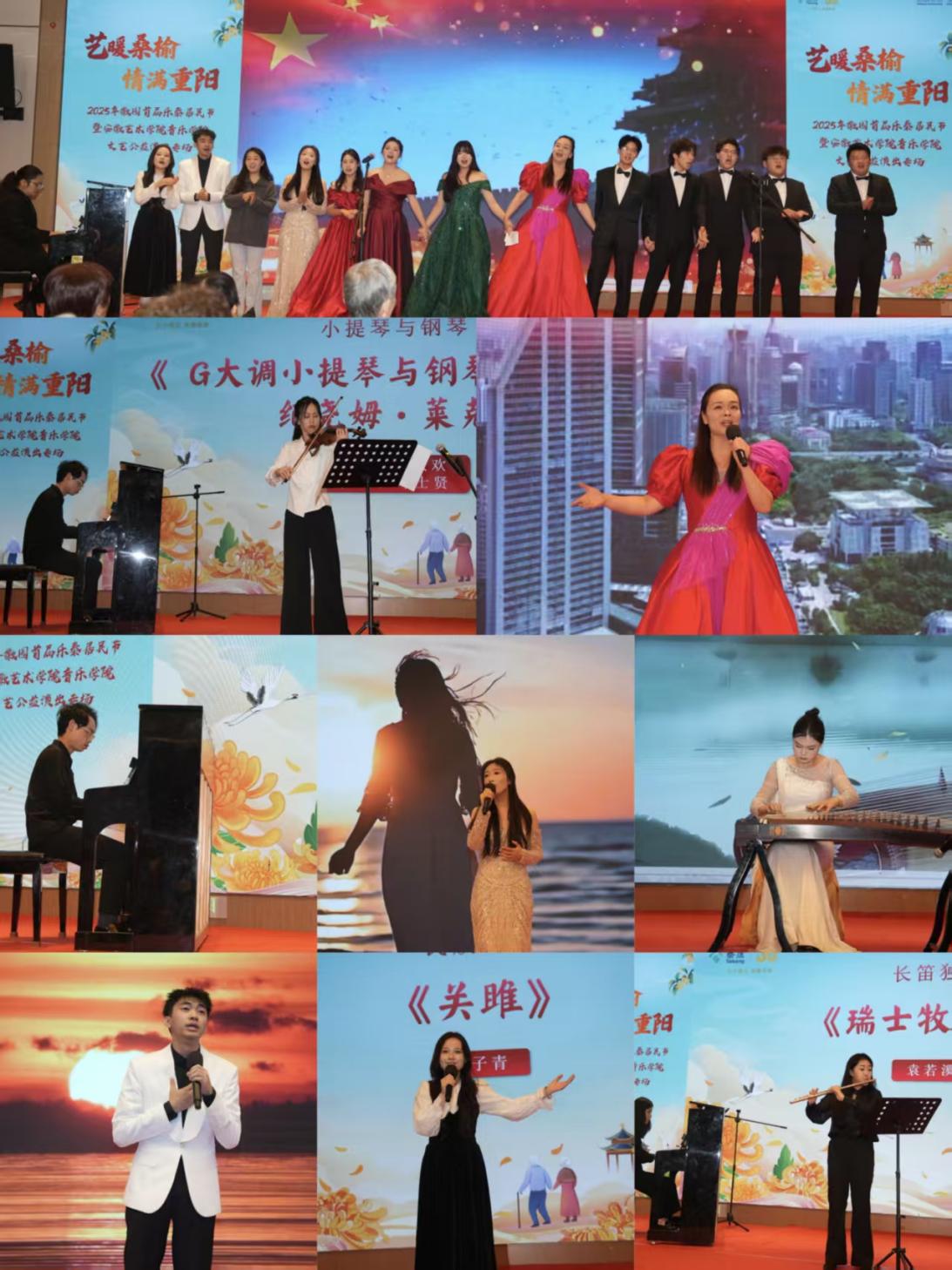 演出由安徽艺术学院教师叶士贤带来的钢琴独奏《圆舞曲》(莫里斯·拉威尔)拉开序幕,为现场营造了优雅的艺术氛围。随后,安徽艺术学院教师孙欢欢与叶士贤合作的《G大调小提琴与钢琴奏鸣曲》(纪尧姆·莱克)将观众带入古典音乐的殿堂。黄梓翔的美声独唱《夕阳红》表达了对老年生活的美好祝愿,古筝独奏《晓雾》、民族独唱《关雎》、长笛独奏《瑞士牧羊人》和流行独唱《世界赠予我的》等节目轮番上演,形式多样,内容丰富。安徽艺术学院教师赵艳艳的女声独唱《我爱你中国》和男女声小合唱《遍插茱萸少一人》更是将现场气氛推向高潮,最后全体大合唱《我和我的祖国》表达了对祖国的深深热爱。