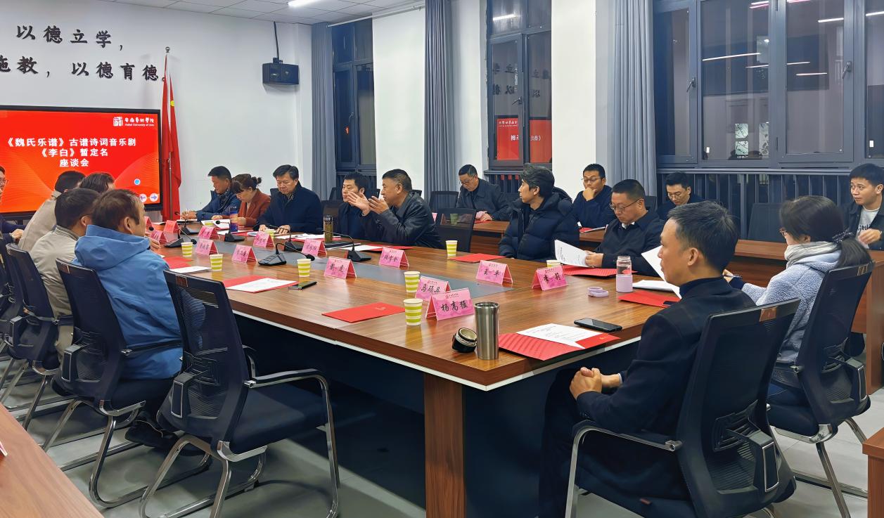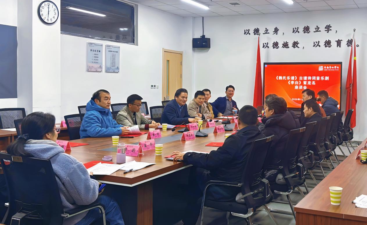 座谈会在安徽艺术学院音乐南楼104会议室举行。项目负责人张祖顺率先介绍了音乐剧《李白》的创作思路、实施路径、宣发设计以及备演情况。马鞍山市艺术剧院副院长江辰、马鞍山市文旅局党委委员兼市文化馆馆长周霍祁、马鞍山市人大常委会教科文卫工委副主任吴大巢、马鞍山市文联党组书记李莉、马鞍山市委宣传部副部长兼市委网信办主任齐道明、马鞍山市委宣传部常务副部长王平以及中国歌剧舞剧院导演(舞剧《李白》导演韩宝全),均对该剧给予了高度评价,并围绕审看内容提出了建议。陈永红部长对该剧高度认可,认为其超出了预期效果,同时在戏剧结构、在地化诗词元素融合以及艺术疗愈价值探索等方面给出了指导意见。曹晓富副校长对马鞍山方面一行表示热烈欢迎,称赞音乐学院、戏剧学院和舞蹈学院协同合作打造出了高水平艺术作品,肯定了校地合作推动科研成果转化以服务社会的成效,并督促音乐剧《李白》剧组精心打磨作品,为马鞍山市民奉献一场精彩演出。