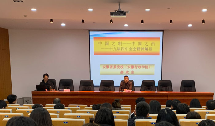12月13日下午,省委党校(省行政学院)党史党建教研部主任郝欣富教授应邀来我校,以《中国之制——中国之治》为题作党的十九届四中全会精神宣讲报告。学院党委书记、院长樊嘉禄主持会议。