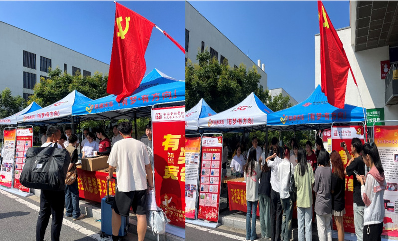 9月7日2023级新生报到当日,马克思主义学院直属党支部走进迎接新生现场,围绕“巩固深化主题教育成效,为新生上好第一堂思政课”主题与习近平新时代中国特色社会主义思想学习研究社联合开展迎新志愿服务。