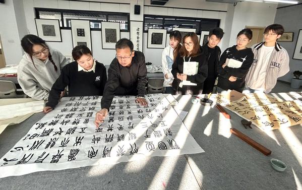 李树祥,民建河南省文化委副主任、河南省书画家协会副主席,其书风独具特色、俊秀流丽,气韵生动、古韵盎然。李树祥具体解析国展的要求,全面、细致地讲解了临摹与创作的转换,古为今用的创作观念,参展作品的内容、字体、款式等内容,并亲自示范,对参展同学的作品耐心指导。